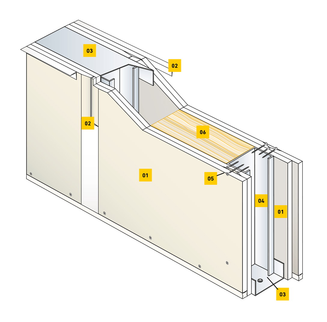 Cloison de distribution constituée par assemblage de quatre plaques de largeur 120cm, vissées sur une ossature métallique délimitant un vide de construction.